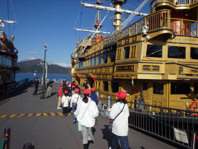 2日目は箱根関所を見学し、海賊船に乗りました。湖上は風が吹き、山中の冷たさが身に沁みましたが、小さな船旅に大喜び。40分の海賊気分を存分に味わいました。